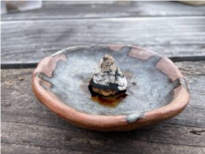Our incense is sold in a set of 5 cones, on a clay dish made from clay foraged from earthworks on the land where we work. The dish is then glazed with hand made ash glaze created from our campfires and finally wrapped in a silk cloth which we’ve dyed naturally with leaves from various species of eucalypt and other local plants.